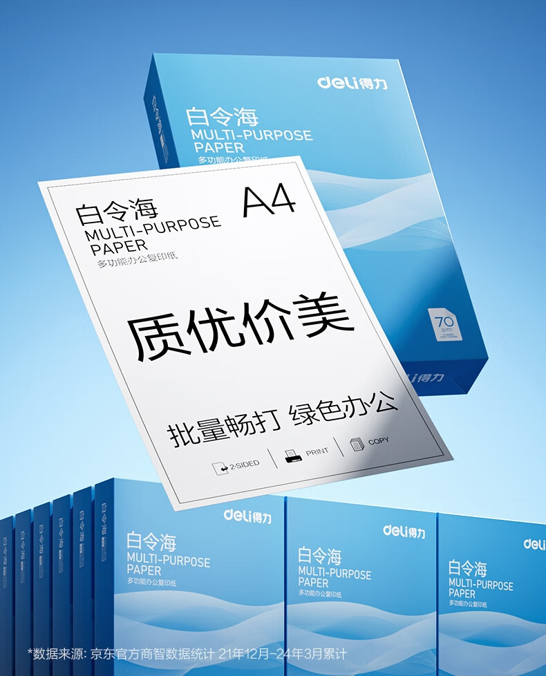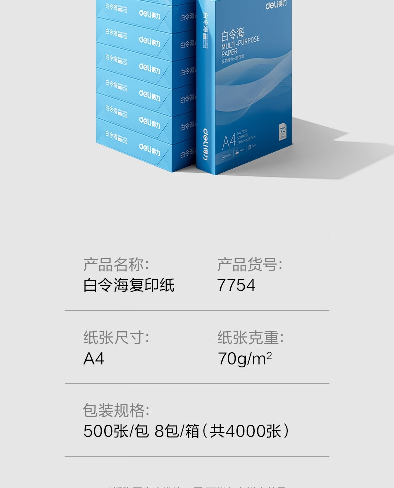 得力(deli)白令海A4打印纸 70g500张*8包一箱 双面高性价比复印纸 整箱4000张【经济热销】