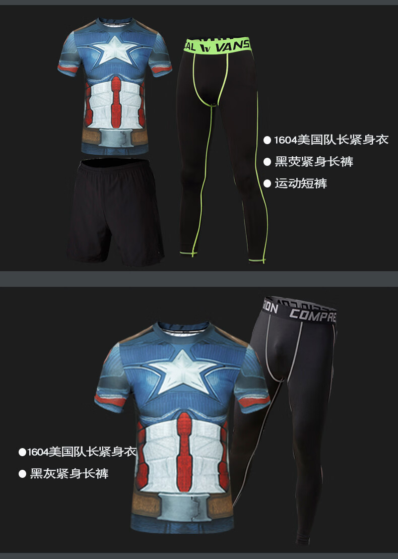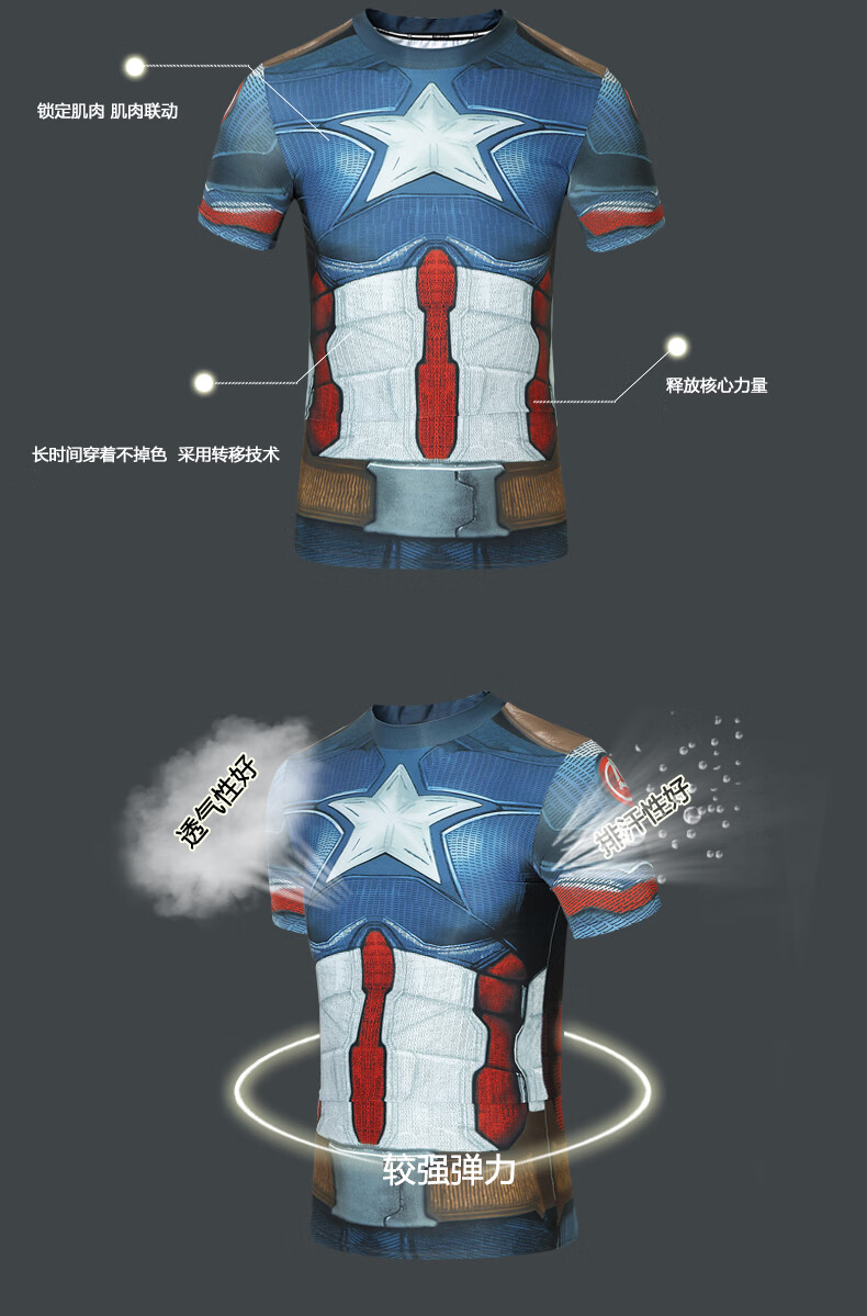 虎迹漫威美国队长紧身衣pro男锻炼健身服训练服速干跑步弹力 蓝红白(短袖) 2XL 建议185斤左右