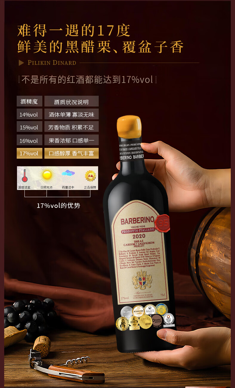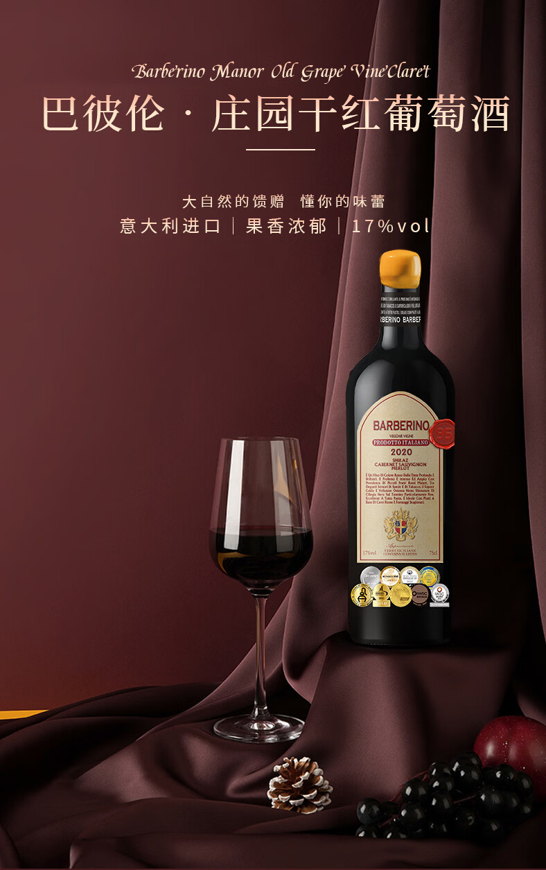 巴彼伦【17度红酒礼盒装】意大利原瓶进口干红葡萄酒DOCG级赤霞珠送礼酒 【9奖冠冕/稀有17度】套餐一:2瓶酒+1个礼盒