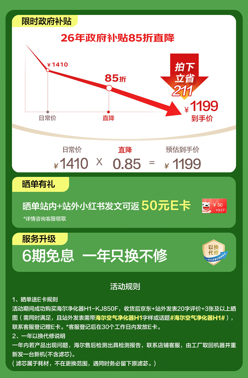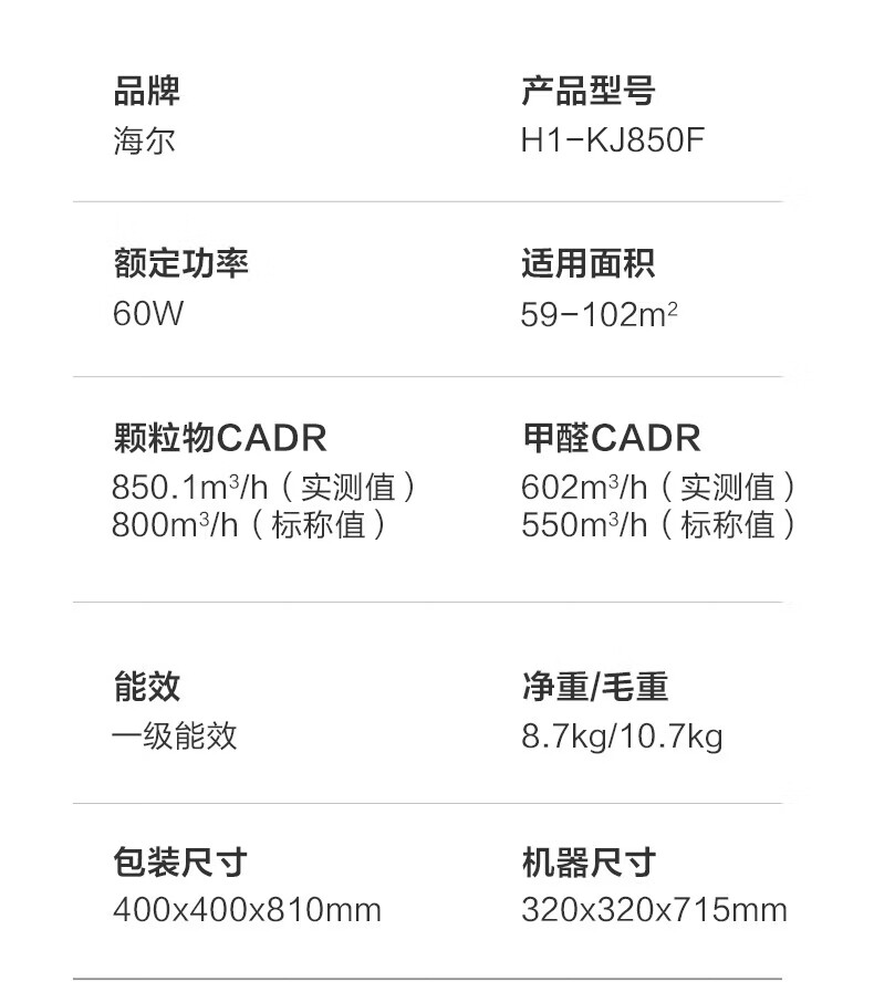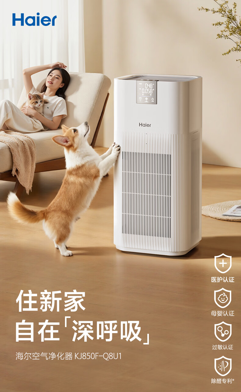 海尔(Haier)【国家补贴】空气净化器除甲醛流感除过敏原防雾霾母婴认证除菌除宠物异味二手烟H1 KJ850F热销2w+